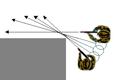 This quicker method involves walking in an arc, smoothly and with a lowered center of gravity, around the corner with the hips facing in the direction of movement while the head, eyes, arms and any weapons (improvised or otherwise and held in a defensive ready-position, prepared to engage potential adversaries) are oriented toward the center of the imagined circle and directed past the corner to see and be prepared to engage with whatever is beyond it.