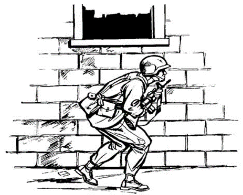 Move past windows: As with moving past windows outdoors, to prevent silhouetting oneself, it is best to either move back far enough away from the window that one cannot be easily seen from outside (esp. if on an upper floor) or to move under them. The latter can be done by crawling or using a crouched or squatting walk, as listed in the article Individual Stealth Movement.
