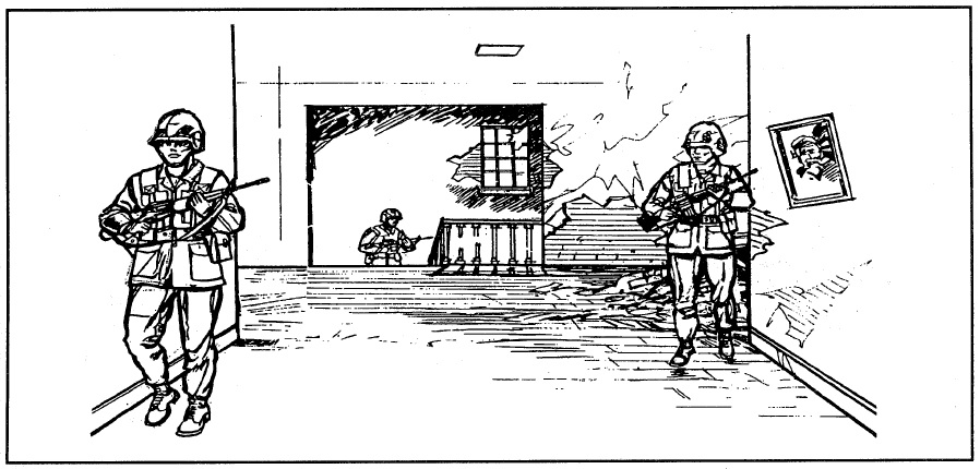 If you intend to go straight and pass both rooms, however, glance left and right as you pass both doorways. It may be advisable to turn around and pause after passing both doorways to listen and observe to know if you have been detected and if it is necessary to increase speed to escape or to engage with a pursuer.