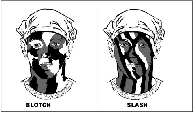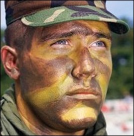 A similar principle is also at play in yet another approach to applying face paint camouflage, one which pays more attention to reversing the effects of shadows than to texture. Herein, darker paint is applied to protruding surfaces like the brow ridge, nose, cheekbones and chin (as discussed above with regard to reducing shine), while lighter paint is applied to sunken or otherwise shaded areas like the eye sockets, hollows of the cheeks, under the lower lip, etc.