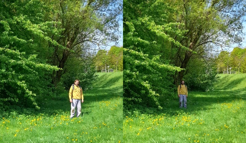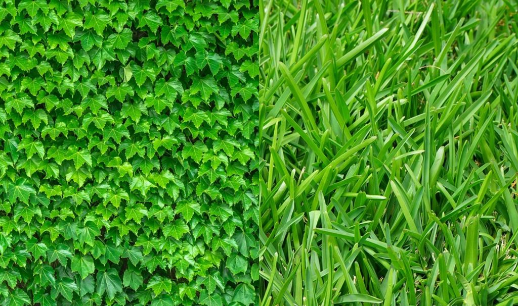 –Texture: Despite comparable colors or shades, surface textures may also vary, such as being smooth, rough, leafy, grassy, etc. For example, the below image features foliage with two only slightly different shades of green, but with quite different textures, one leafy and the other grassy.