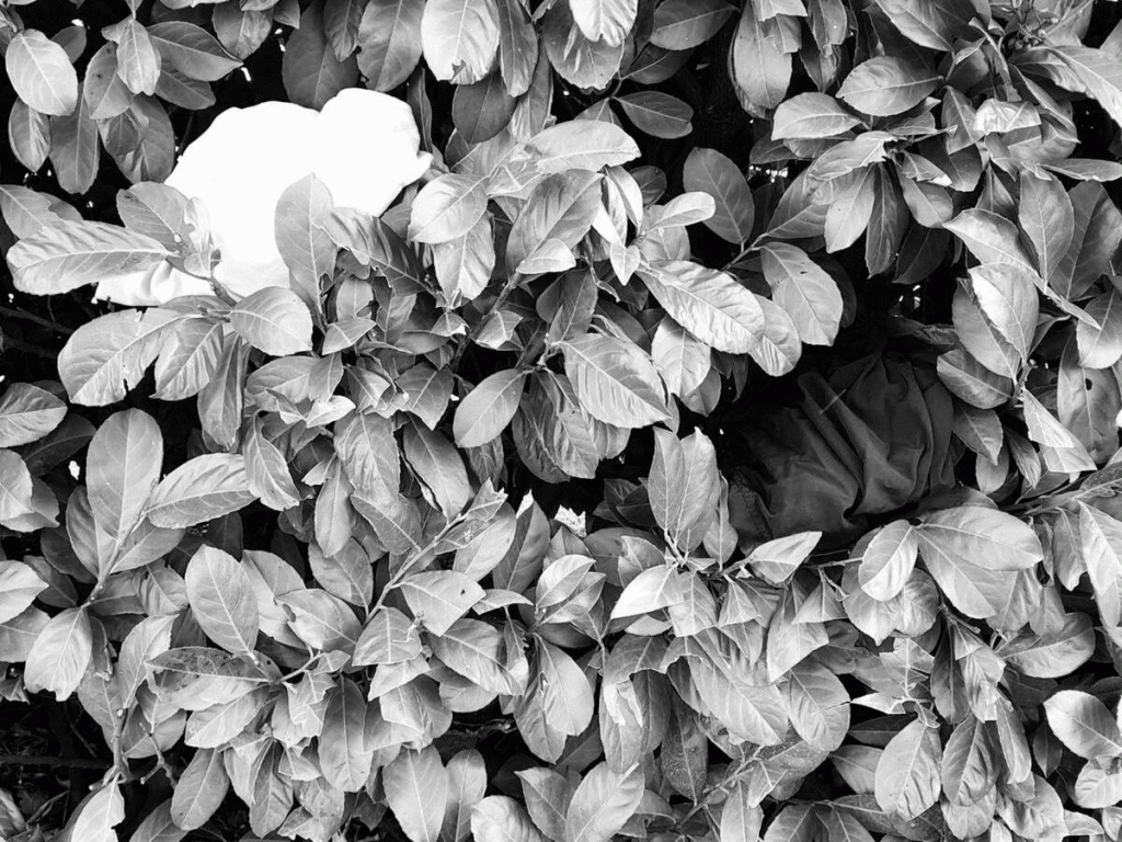–Contrast: Although our vision in darkness does not perceive different colors, it can detect variations in shade, which we are referring to here as contrast. For instance, even at night, contrary to common depictions in popular fiction, black is rarely if ever a color that blends well with any environment. It instead usually stands out as anomalous, being too dark in shade to match its surroundings. Hence, black or white and other very dark or very light shades of color tend to stand out. This risk, as well as the risk of exposure associated with any non-matching colors in general, can be 1.) eliminated by completely concealing such colors, 2.) reduced by changing the color itself to more closely match the environment, such as with paint or dye (though this can be time-consuming and impractical for short range self-protective evasion), or 3.) mitigated by partial concealment and camouflage. By way of illustrating the third option, the figure below features two balled-up pieces of fabric, one white and the other black. In three successive images, they are placed first superficially on the outside of a bush, then within the bush just behind the outer wall of foliage and finally deeper inside the bush.